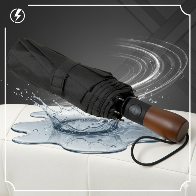 Конструкція з 9 спиць забезпечує стійкість до вітру, а система антивітер захищає від вивертання. Автоматичний механізм дозволяє відкривати та закривати купол одним натисканням. Дерев’яна ергономічна ручка додає статусу, зручно лежить у руці та не вислизає.