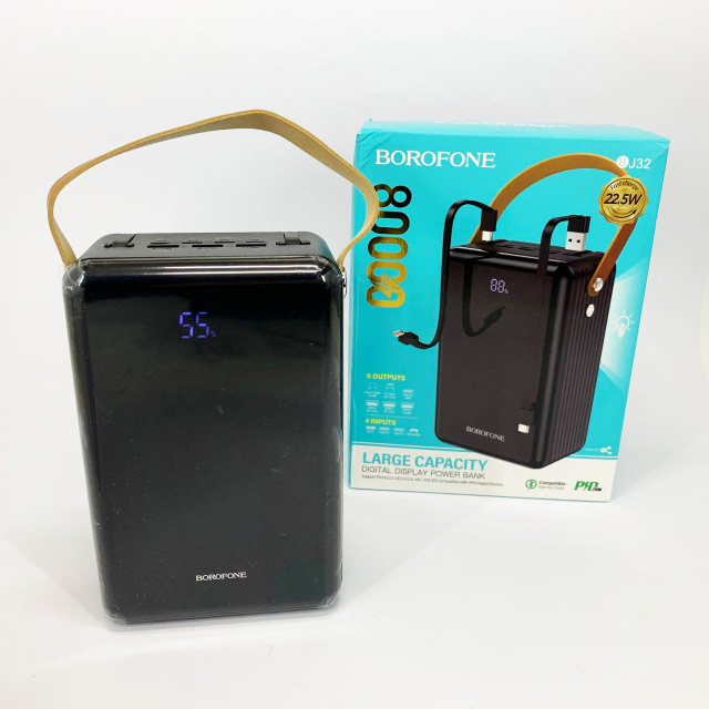 ВИСОКОЄМНИЙ ЗОВНІШНІЙ АКУМУЛЯТОР BOROFONE JB32 80000 MAH – це новинка для різноманітних мобільних пристроїв, призначена для тривалого автономного використання в подорожі, поході, поїздці, на дачі і т.д. Цей оригінальний Power Bank, як і інші, підходить для зарядки величезної кількості гаджетів, але має суттєву перевагу – неймовірно високу ємність 80000 міліампер годин. Пристрій підтримує технологію Quick Charge 3.0 PD 20W, таким чином забезпечує високу швидкість заряджання. Наявність цифрового LED дисплея поінформує Вас про заряд, що залишився у відсотках.